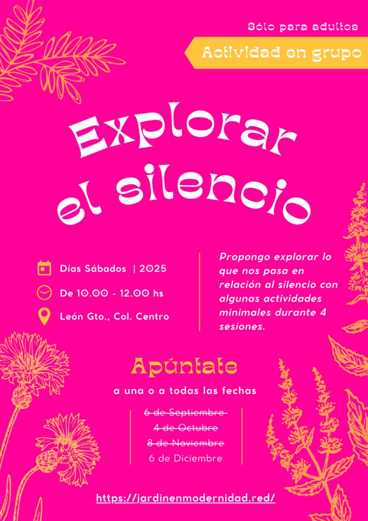 Nos invito a explorar lo que nos pasa en relación al silencio durante cuatro sesiones sabatinas de dos horas. Mi propuesta es realizar unas cuantas actividades minimales que nos permitan conocer lo que nos pasa al estar con otres cuando el espacio común no tiene porque ser llenado con palabras.
